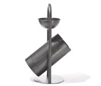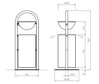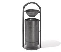 Trägerelement ist ein halbkreisförmiges Rundrohr. Der Abfallbehälterkorb besteht aus Lochblech mit Rundlochung.