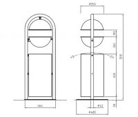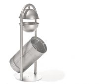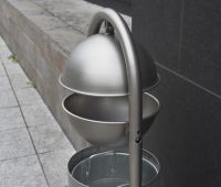 Trägerelement ist ein halbkreisförmiges Rundrohr. Der Abfallbehälterkorb besteht aus Lochblech mit Rundlochung.