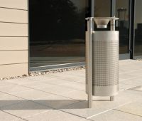 Ein bewährtes Abfallbehälter-Modell mit herausnehmbarem, abschließbarem Innenteil und schöner Rundlochung. Auf Wunsch mit drehbarem Dach und Innenbehälter lieferbar (Innenbehälter auf Anfrage). Fassungsvermögen 50 Liter.