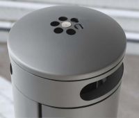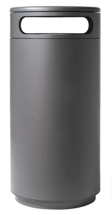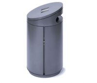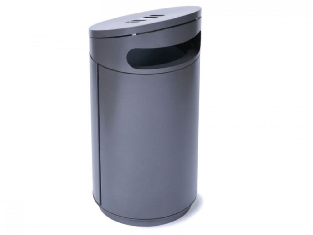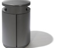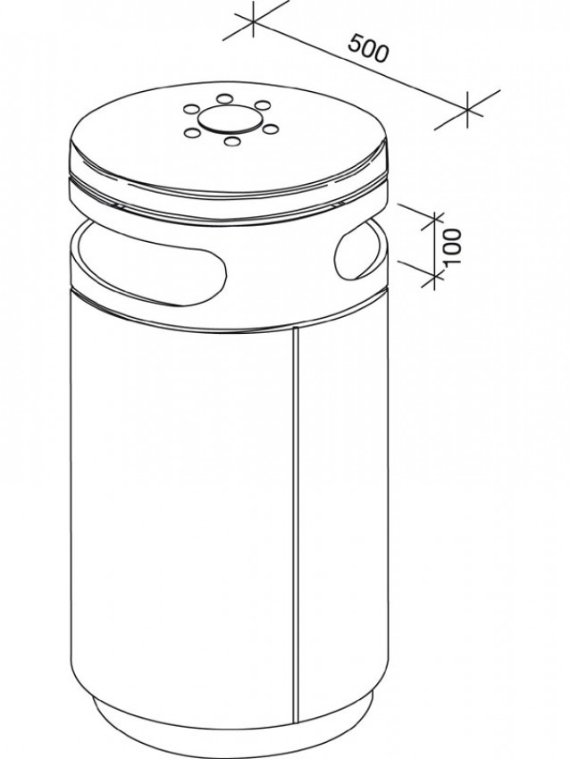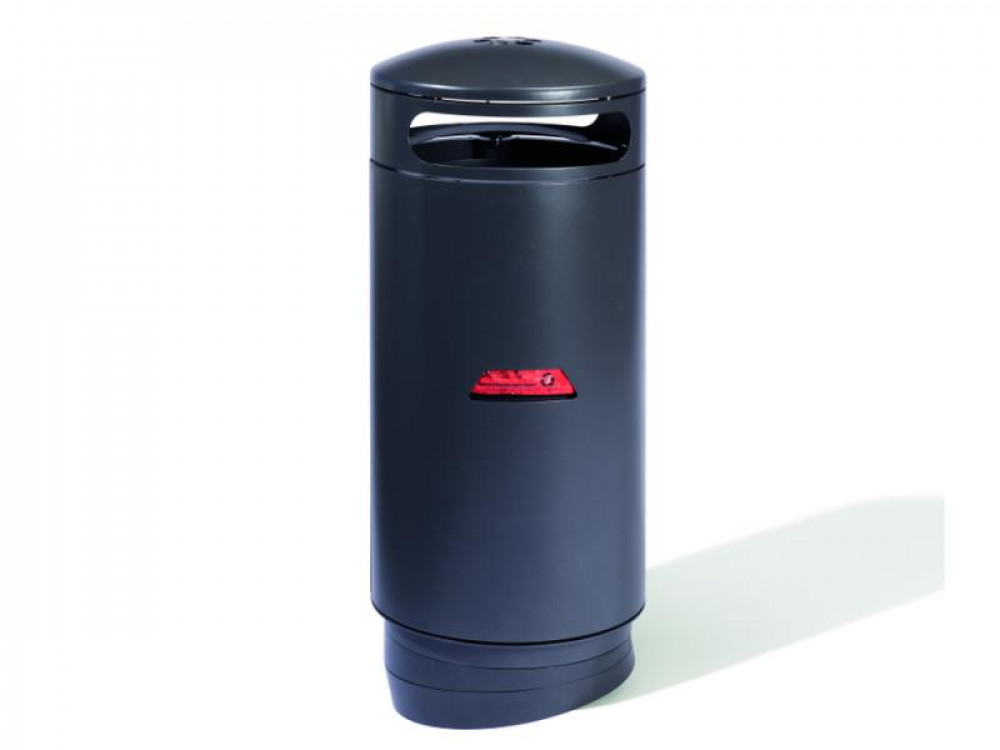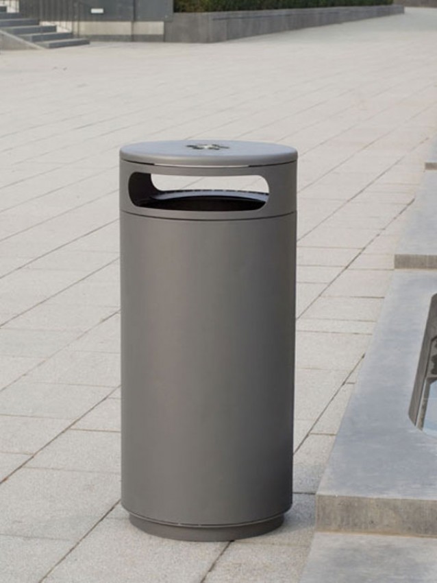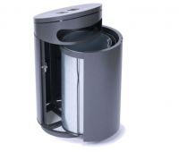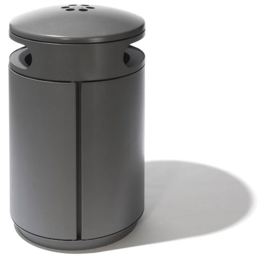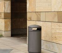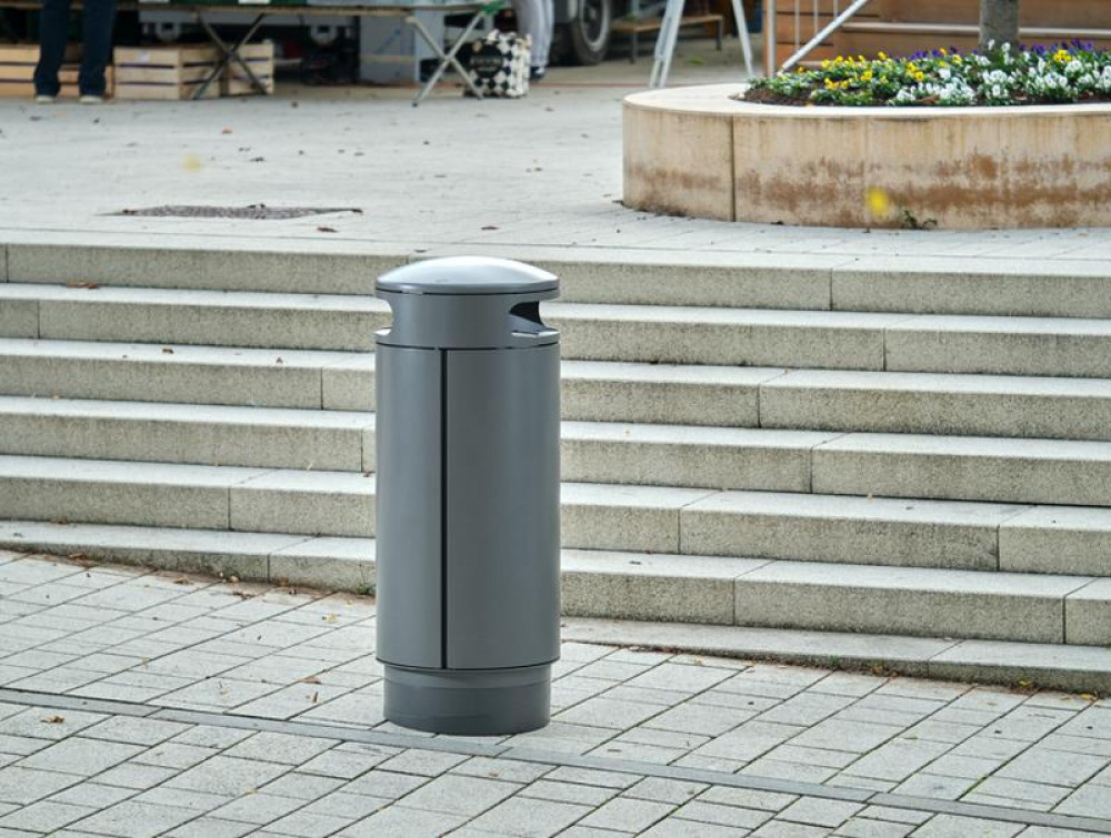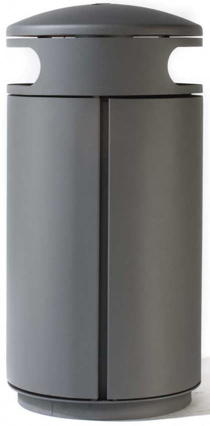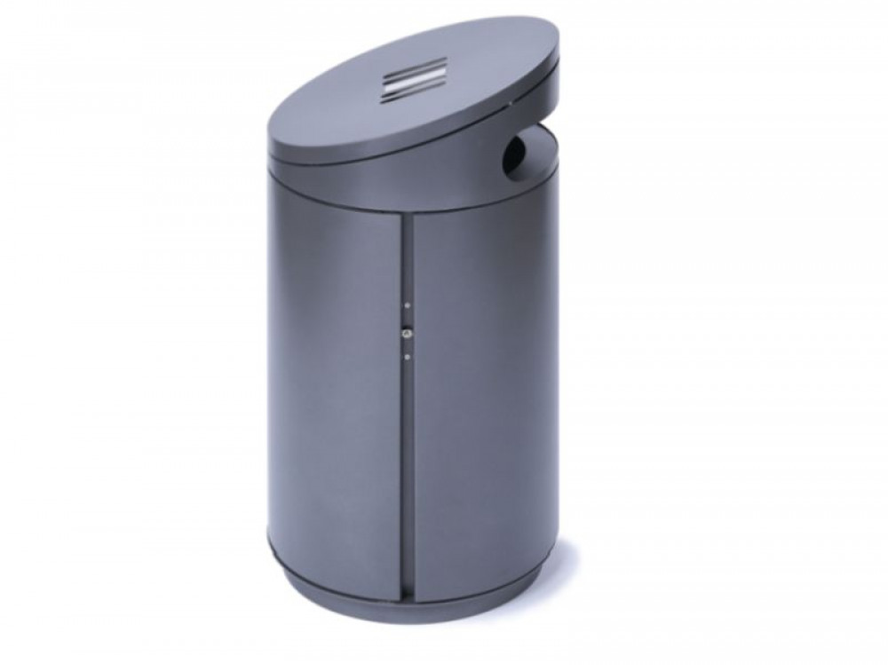 Abfallbehälter mit zwei Einwurföffnungen zum Verdübeln oder Einbetonieren, rund, Inhalt 60 (90, 120) l, Durchmesser 500 mm, mit integriertem Ascher in gewölbtem, schwägen oder flachem Dach, runde Einwurflöcher, Entleerung über Schieber im Ascherboden, Höhe GOK entsprechend Serie A7 ohne Ascher, große Seitentür mit integrierter Halterung für Müllsäcke, optional mit Blecheinsatz, Verriegelung mit Schnappschloss.