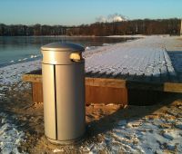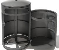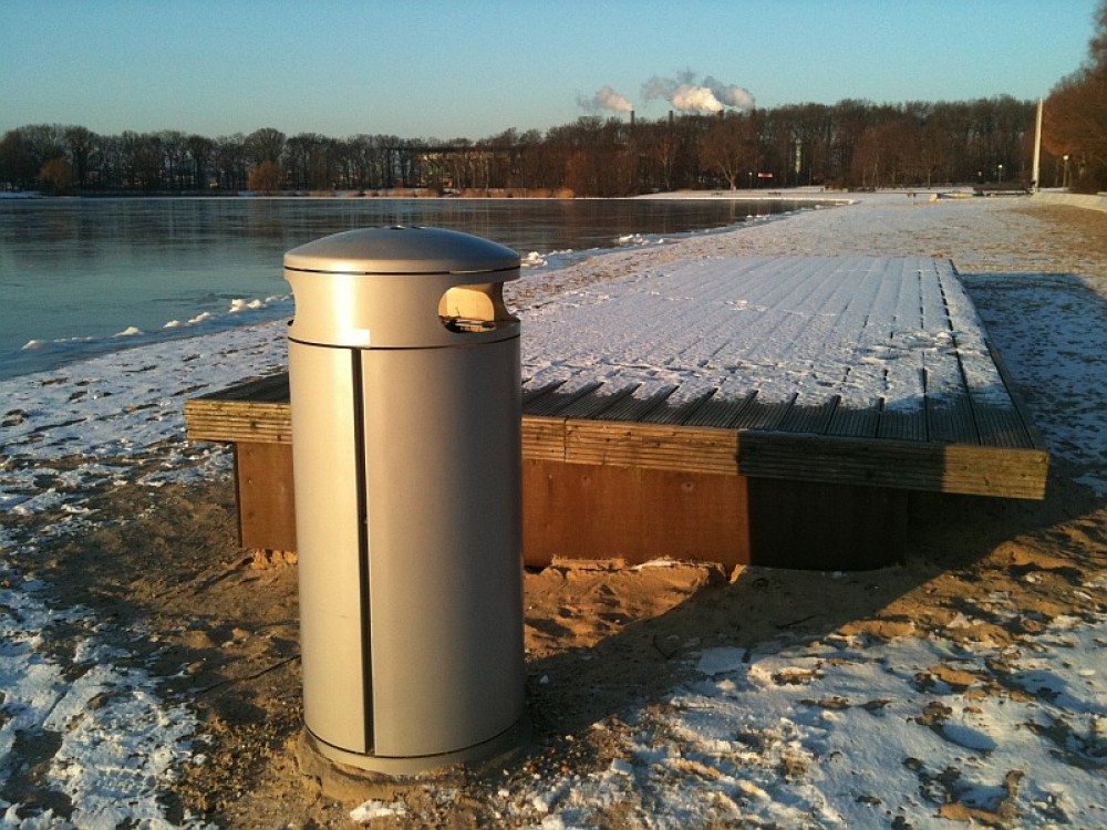 Behälter aus Stahlblech, feuerverzinkt und farbbeschichtet. Sicherung mit 7 mm Dreikantschloss. Gesichert gegen Witterungseinflüsse, unbefugte Müllentnahme sowie Hausmülleinwurf.
