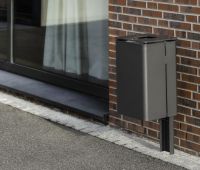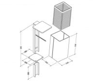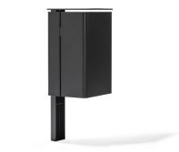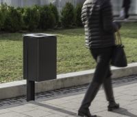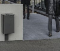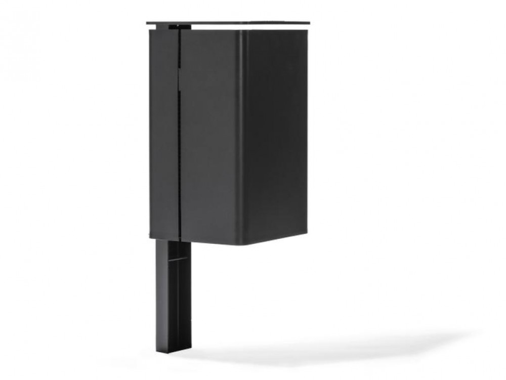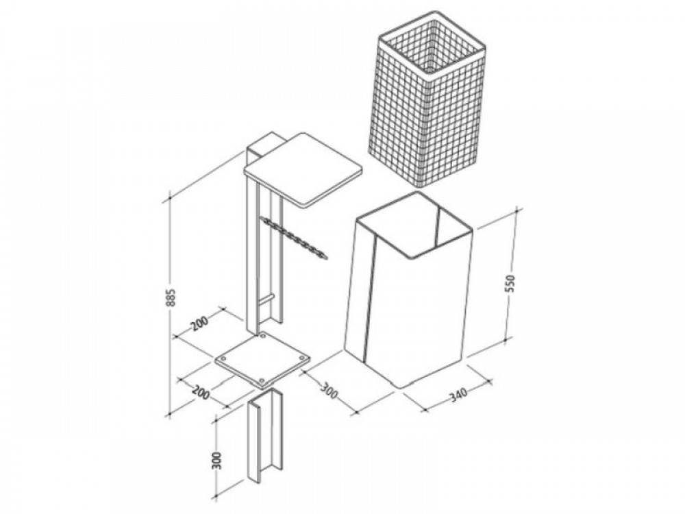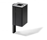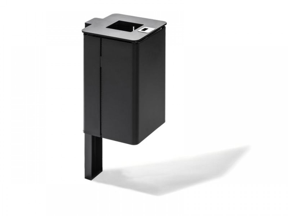 Abfallbehälter zum Einbetonieren oder zur Wandmontage, Abfallbehälter viereckig, Inhalt 56 l, Querschnitt 300 x 340 mm, Behälterhöhe 550 mm, Höhe GOK ca. 885 mm, eckiges Dach aus Stahlblech, Behälter mit Schloss in der U-Profil-Stütze verriegelt; im flachen Dach integrierter Ascher mit Edelstahlblech zum Ausdrücken; Einbauhöhe mindestens 230 mm bis Behälterunterkante.