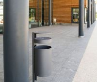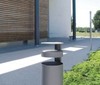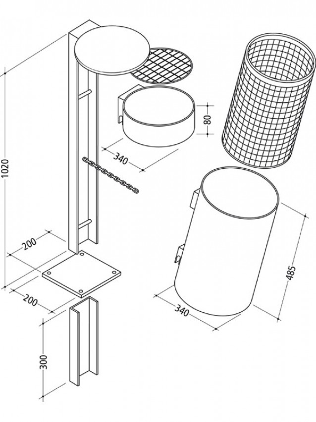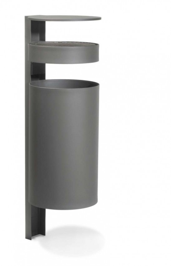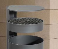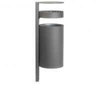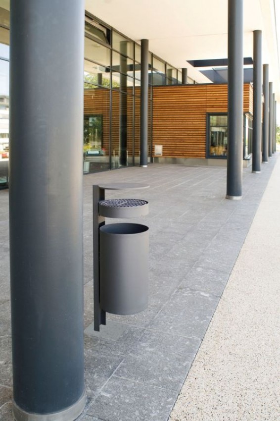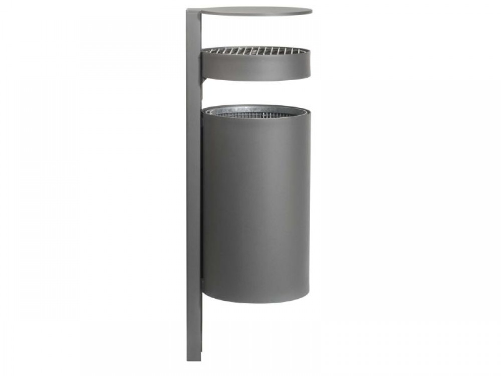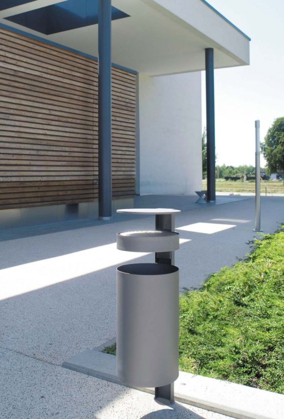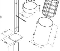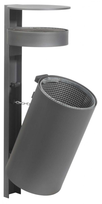 Abfallbehälter-Ascher-Kombination zum Einbetonieren oder zur Wandmontage, Abfallbehälter rund, Inhalt 45 (60) l, Durchmesser 340 mm, Behälterhöhe 485 (585) mm, Ascher rund, Inhalt 7 l, Durchmesser 340 mm, Behälterhöhe 80 mm, Höhe GOK ca. 1.020 (1.120) mm, rundes Dach aus Stahlblech über Ascher angeordnet, Behälter jeweils mit Schloss in der U-Profil-Stütze verriegelt; Einbauhöhe mind. 240 mm bis Behälterunterkante.