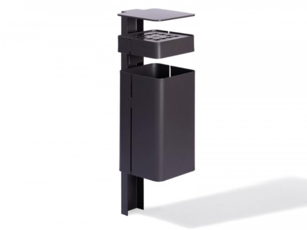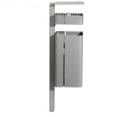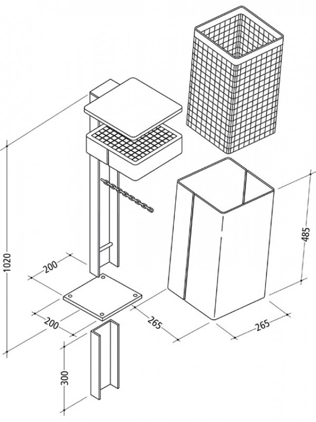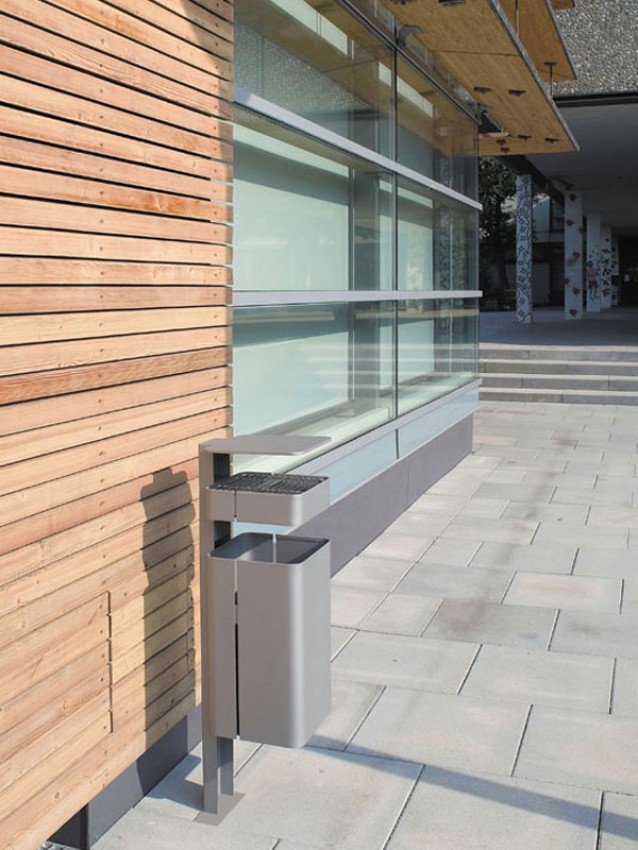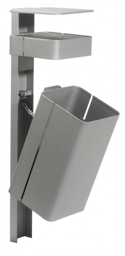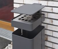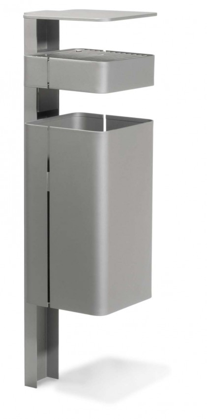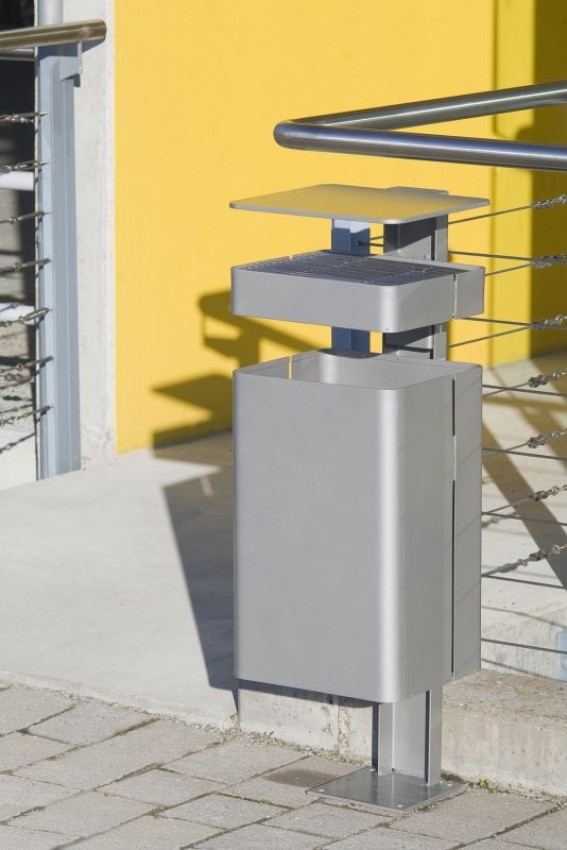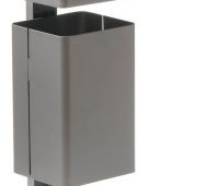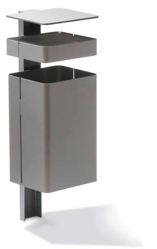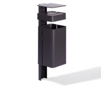 Abfallbehälter-Ascher-Kombination zum Einbetonieren oder zur Wandmontage, Abfallbehälter viereckig, Inhalt 35 (56) l, Querschnitt 265 x 265 mm (300 x 340 mm), Behälterhöhe 485 mm (550 mm), Ascher viereckig, Inhalt 6 l, Querschnitt 265 x 265 mm, Behälterhöhe 80 mm, Höhe GOK ca. 1.020 (1.085)mm, eckiges Dach aus Stahlblech über Ascher angeordnet, Behälter jeweils mit Schloss in der U-Profil-Stütze verriegelt; Einbauhöhe mindestens 220 (230) mm bis Behälterunterkante.
