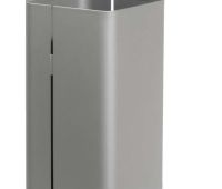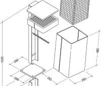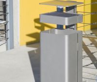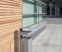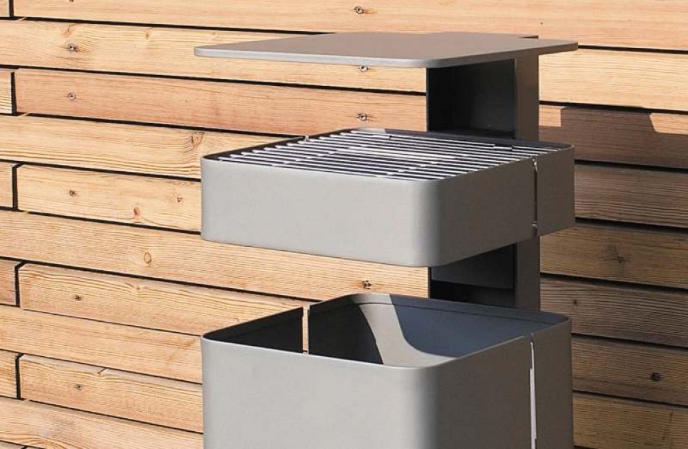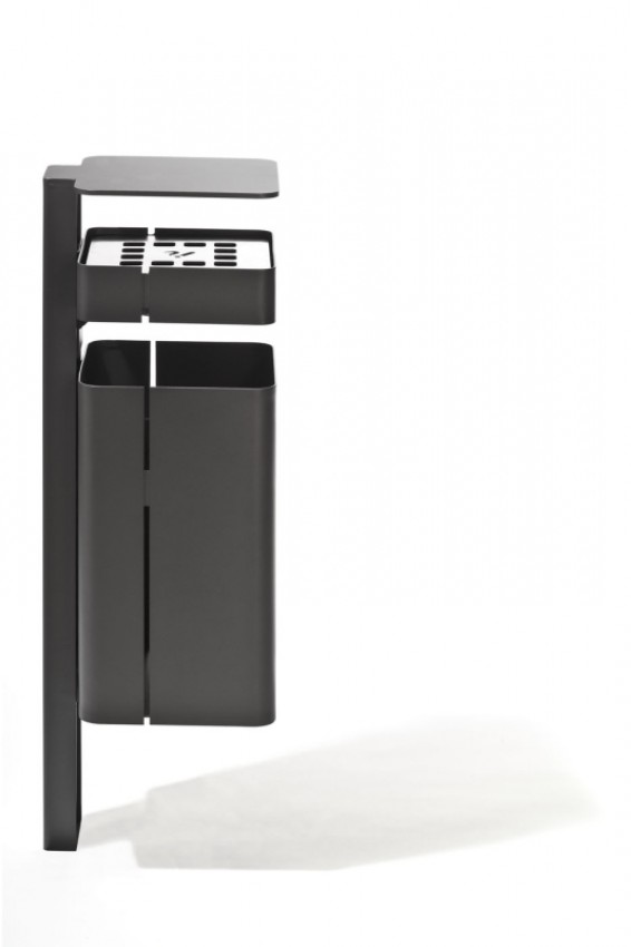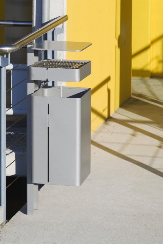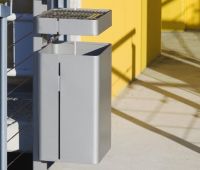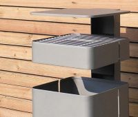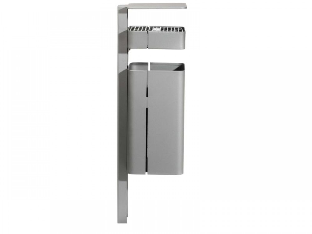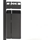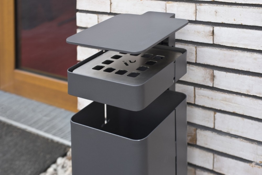 Abfallbehälter-Ascher-Kombination zum Einbetonieren oder zur Wandmontage, Abfallbehälter viereckig, Inhalt 35 (56) l, Querschnitt 265 x 265 mm (300 x 340 mm), Behälterhöhe 485 mm (550 mm), Ascher viereckig, Inhalt 6 l, Querschnitt 265 x 265 mm, Behälterhöhe 80 mm, Höhe GOK ca. 1.020 (1.085)mm, eckiges Dach aus Stahlblech über Ascher angeordnet, Behälter jeweils mit Schloss in der U-Profil-Stütze verriegelt; Einbauhöhe mindestens 220 (230) mm bis Behälterunterkante.