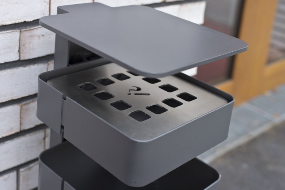 Ascher: Dreikantschloss entriegeln. Vorkippenden Ascher herausnehmen. Nach dem Leeren einhängen und ins Schloss drücken.