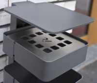 Ascher mit aufklappbarem Gitter oder Blech aus Edelstahl. Blechabdeckung (Option) aus 3 mm dickem, gelasertem Edelstahlblech (Ausführung ...EB).
