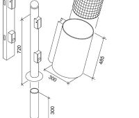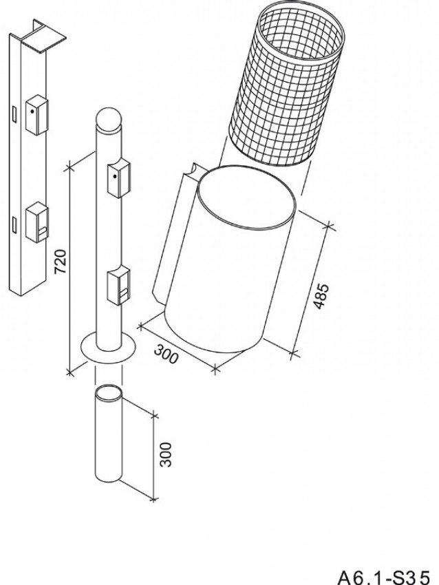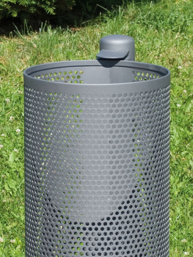 Abfallbehälter zum Einbetonieren, zur Wand- oder Mastmontage, rund, Inhalt 35 (45, 60) l, Durchmesser 300 mm (ab 45 l: 340 mm), Behälterhöhe 485 mm (60 l: 585 mm), Höhe GOK 720 mm (60 l: 820 mm), aus feuerverzinktem Stahlblech (optional Lochblech), Stütze aus Stahlrohr Durchmesser 76 mm, Kippmechanismus mit Schnappschloss zur Schnellentsorgung, gegen Mehrpreis mit wählbaren Kopfformen (s. Detailabbildung); Einbauhöhe mind. 220 (240) mm bis Behälterunterkante.