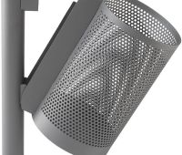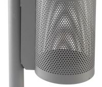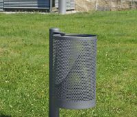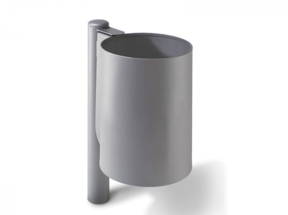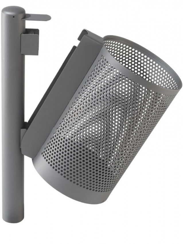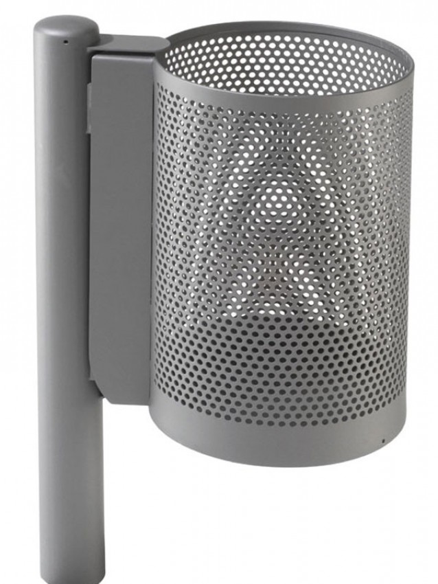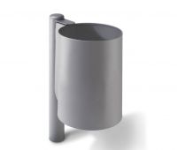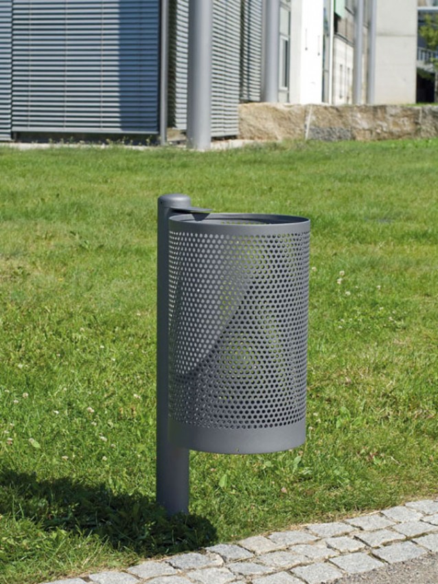 Runder Abfallbehälter ohne Dach an Rundrohrstütze.