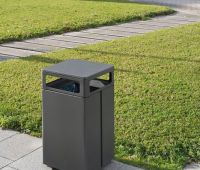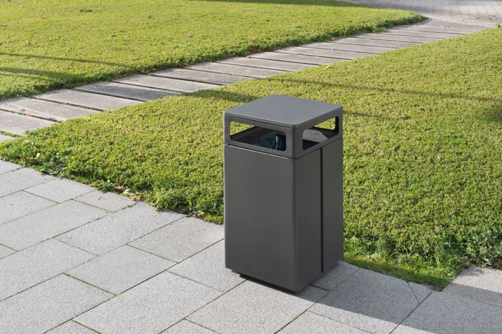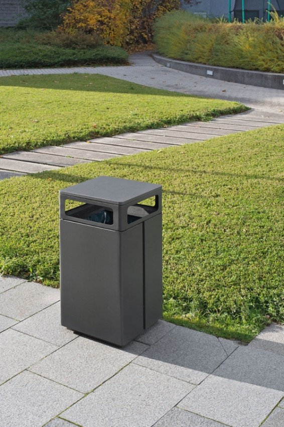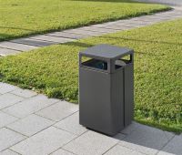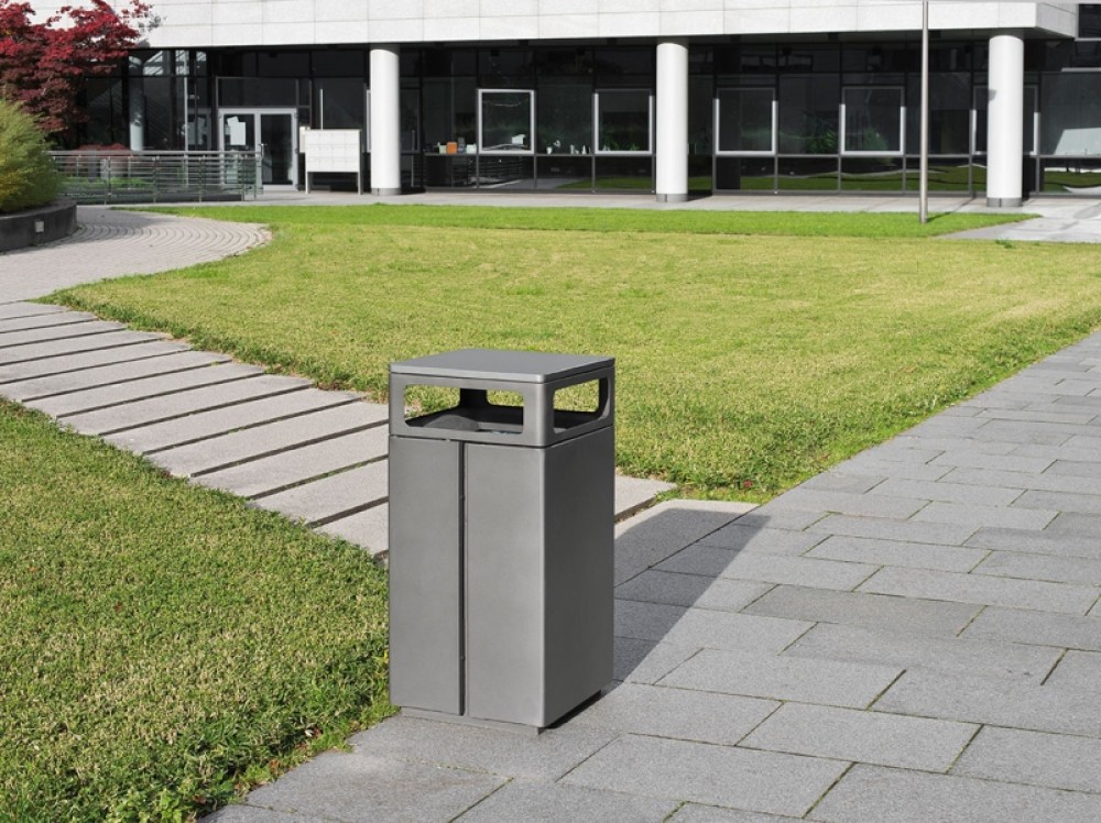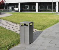 Behälter aus Stahlblech, verzinkt und farbbeschichtet. Sicherung mit 7 mm Dreikantschloss. Gesichert gegen Witterungseinflüsse, unbefugte Müllentnahme sowie Hausmülleinwurf.