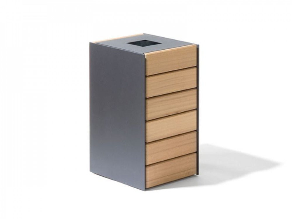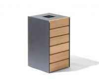 Moderner Abfallbehälter mit Holzverkleidung - passend zu unseren aktuellen Bankfamilien.