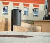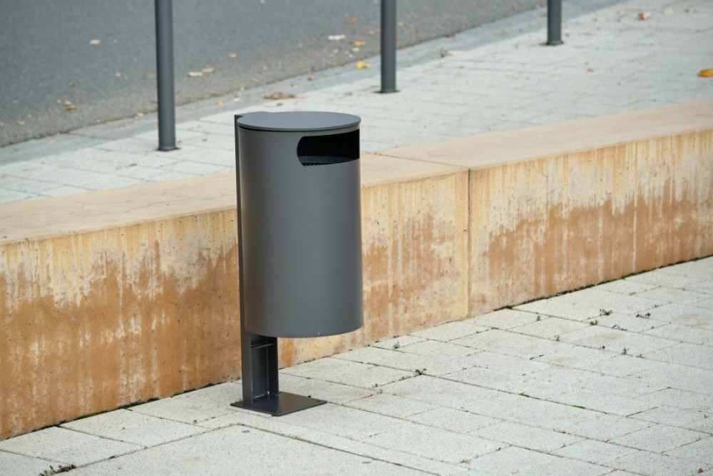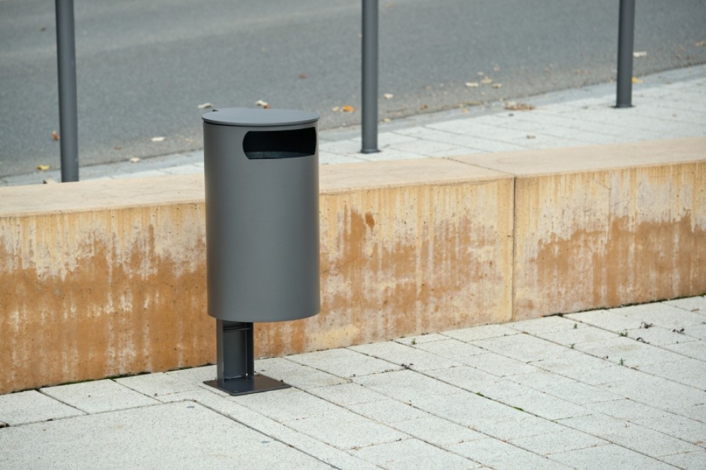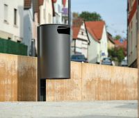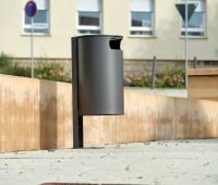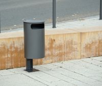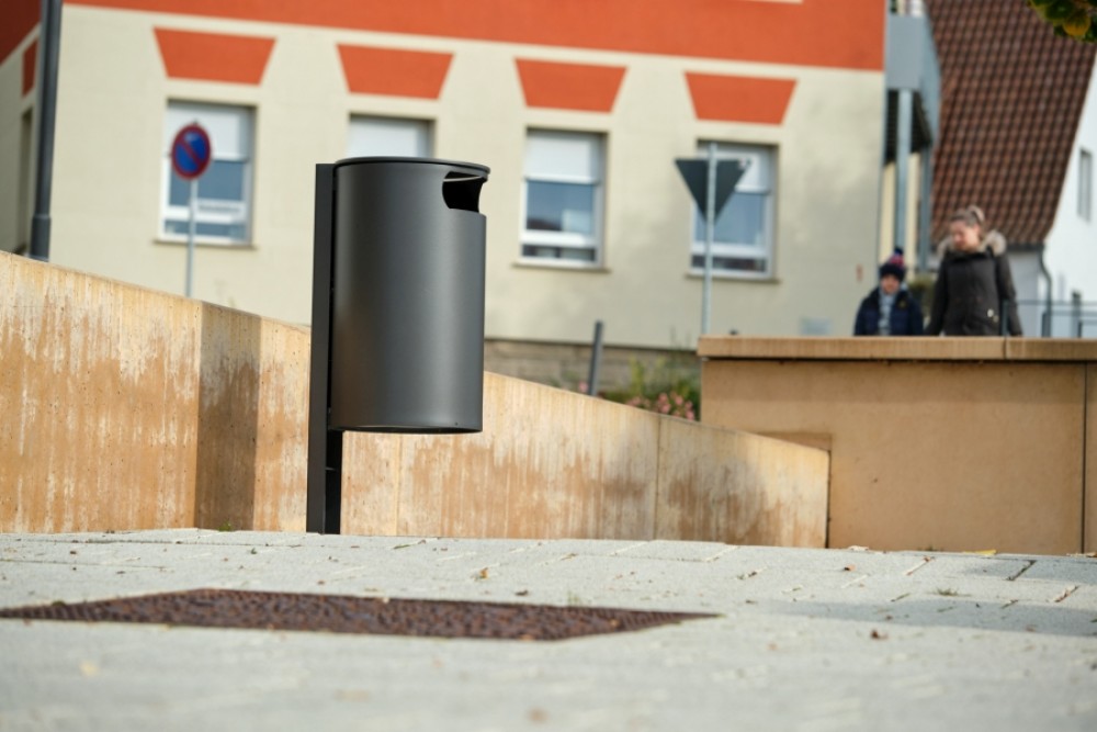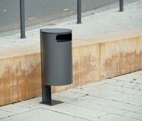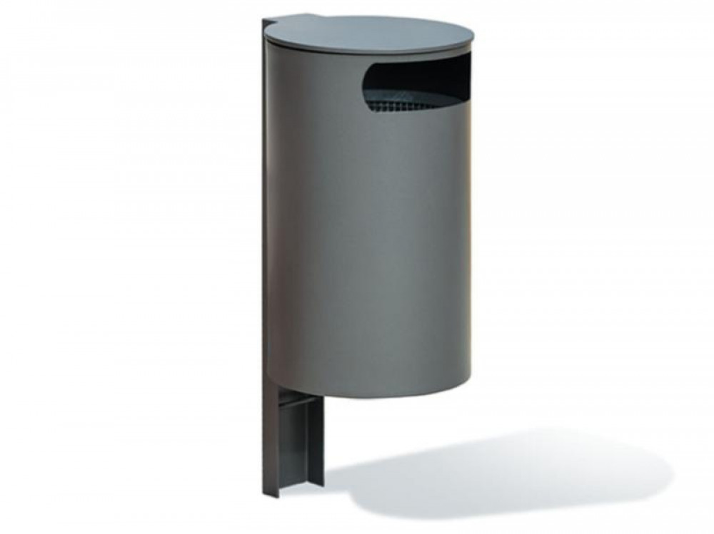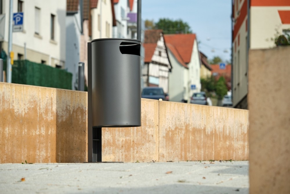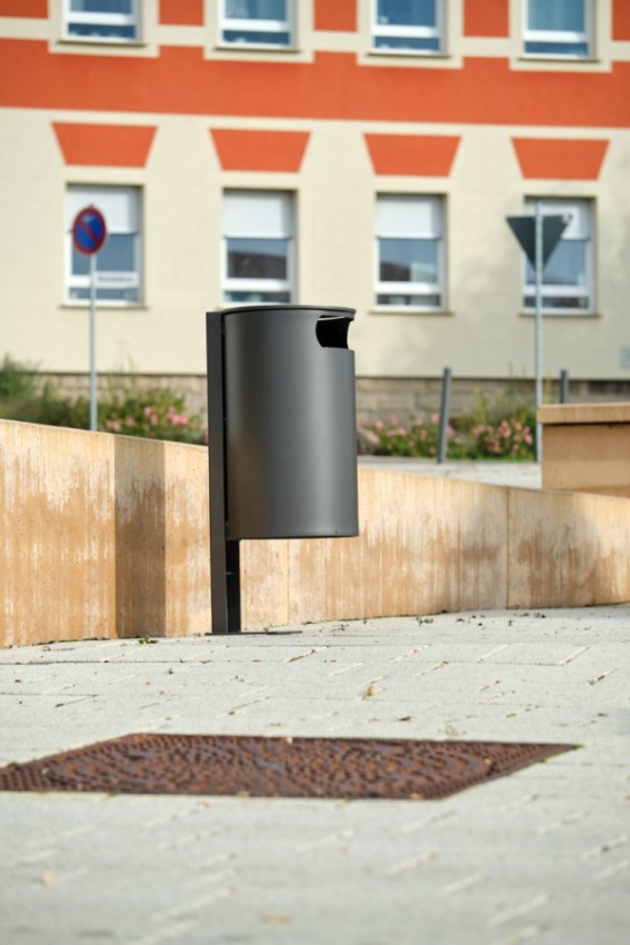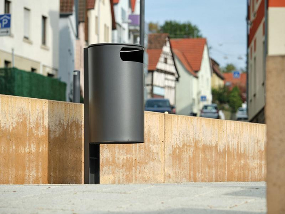 Runder Abfallbehälter an U-Profil-Stütze mit reduzierter Einwurföffnung vorne.