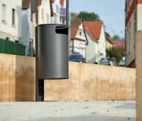 Stahlblech feuerverzinkt. Sicherung mit 7 mm Dreikantschloss. Gesichert gegen unbefugte Behälterentnahme sowie Hausmülleinwurf.