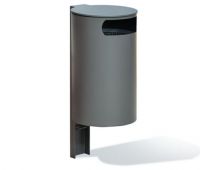 Abfallbehälter zum Einbetonieren oder zur Wandmontage, Abfallbehälter rund, Inhalt 45 l, Durchmesser 340 mm, Behälterhöhe 585 mm, Höhe GOK ca. 820 mm, flaches Dach aus Stahlblech, Einwurföffnung vorne im Behälter, Behälter mit Schloss in der U-Profil-Stütze verriegelt; Einbauhöhe mindestens 240 mm bis Behälterunterkante.