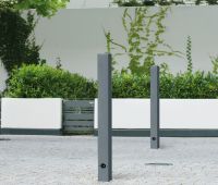 Sperrpfosten wahlweise feststehend, kippbar oder herausnehmbar; Quadratrohr 80 x 80 mm, feuerverzinkt, optional mit Farbe, Höhe GOK 900 mm, aufgeschweißte Stahlkappe.
