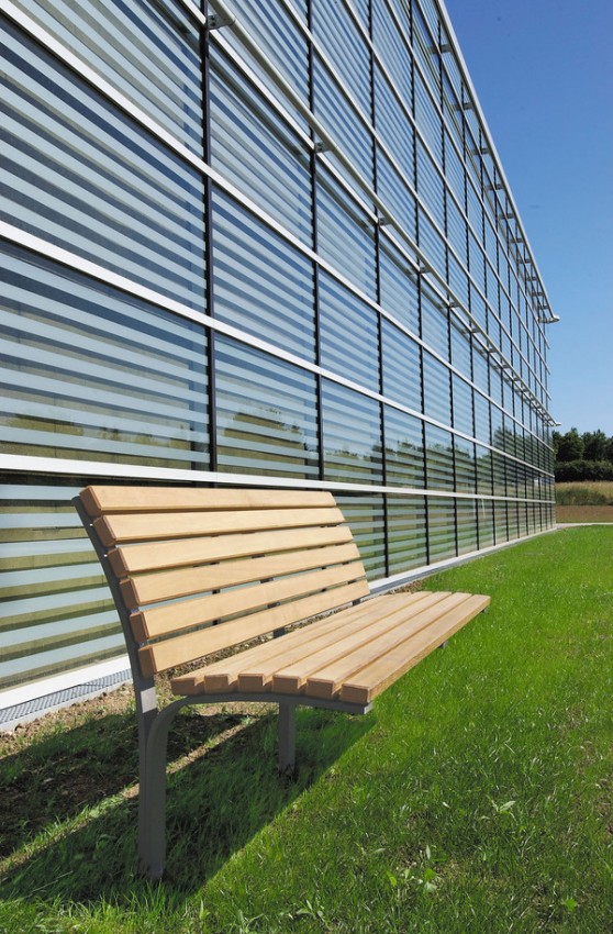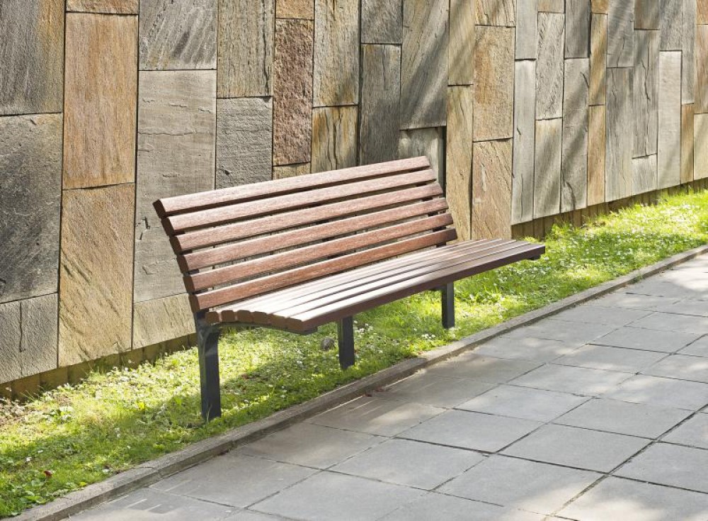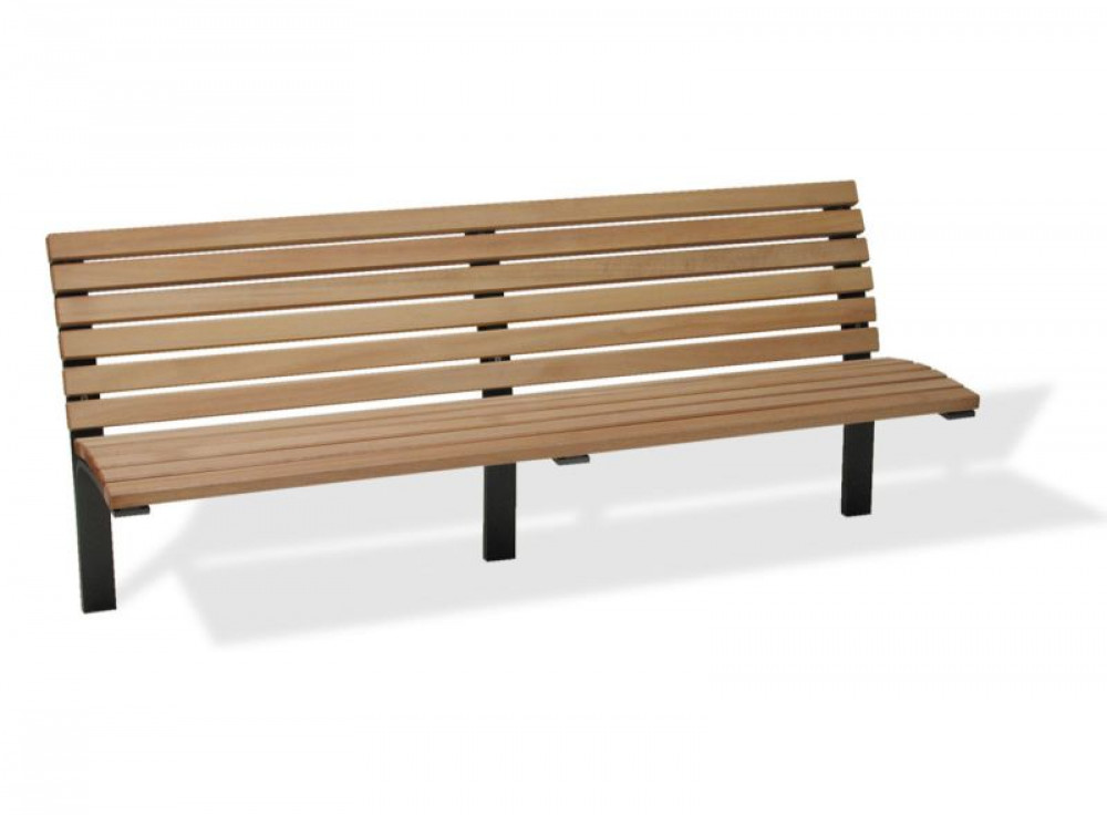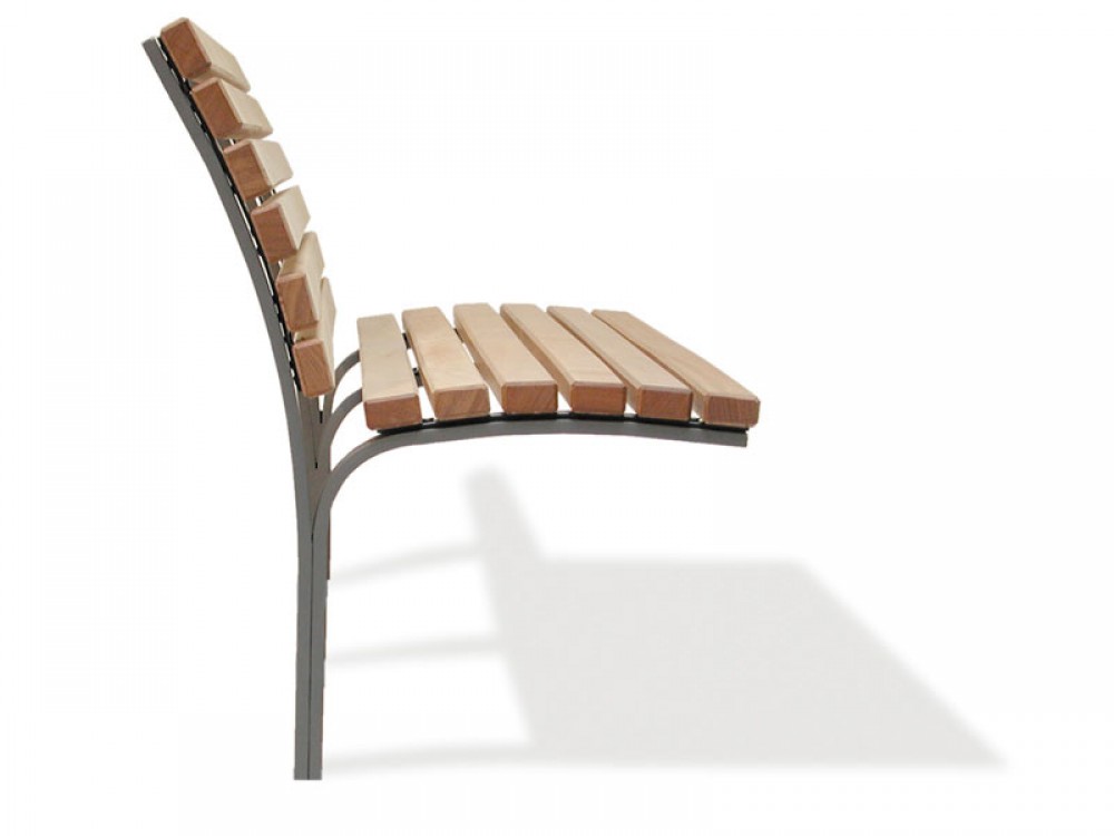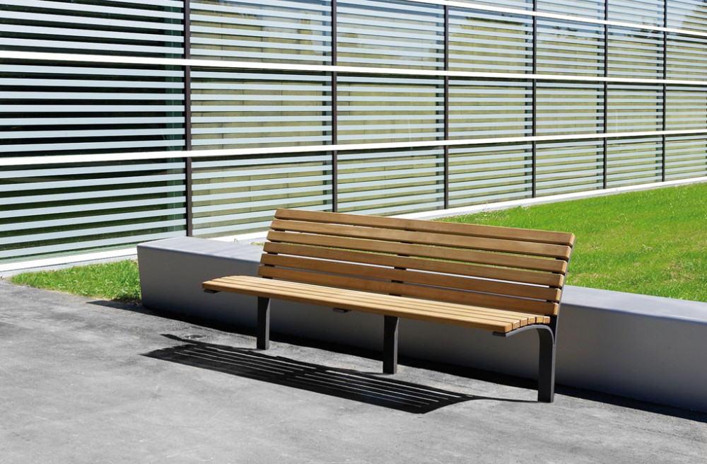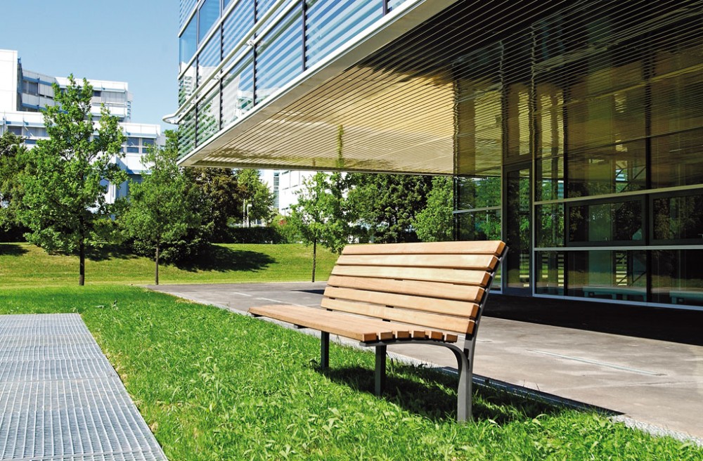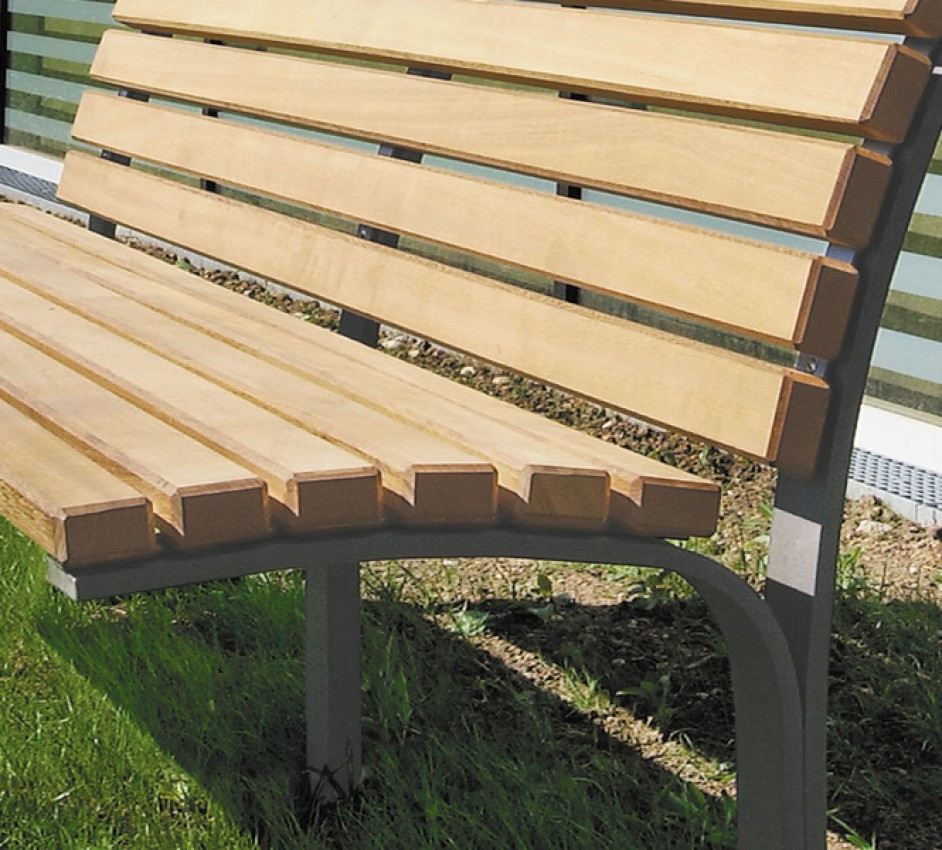 Gestell aus Flachstahl feuerverzinkt und mit Pulverbeschichtung. Standardfarbe DB 703, anthrazit-eisenglimmer, verlängert zum Einbetonieren. Separate Auflagen für Sitzfläche und Lehne, dadurch einfach abnehmbar.