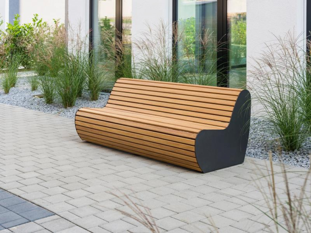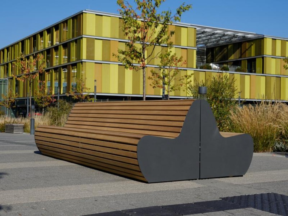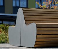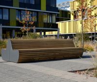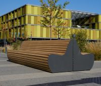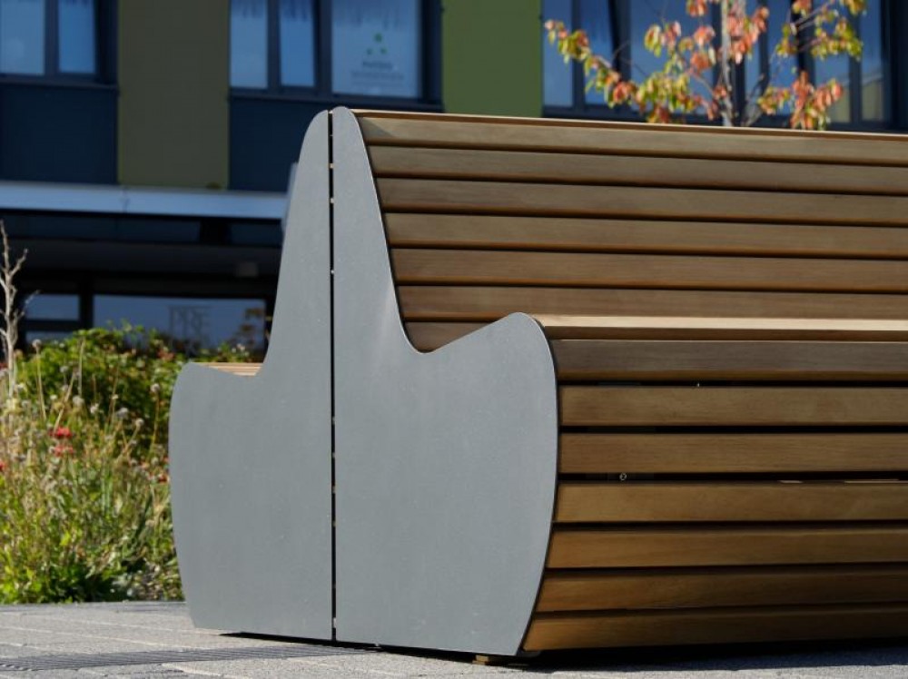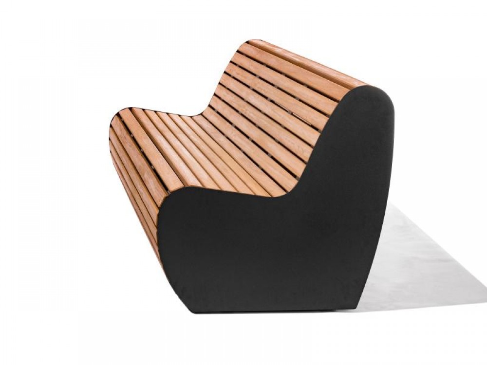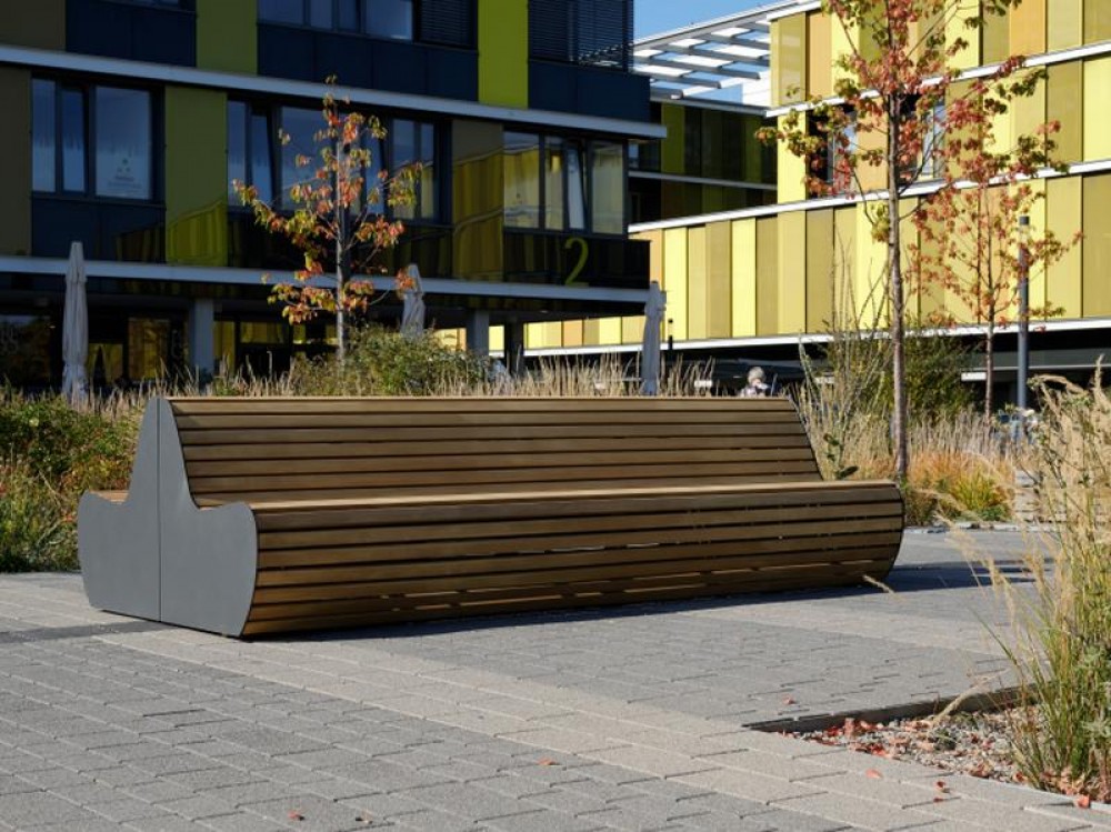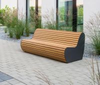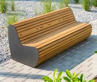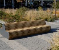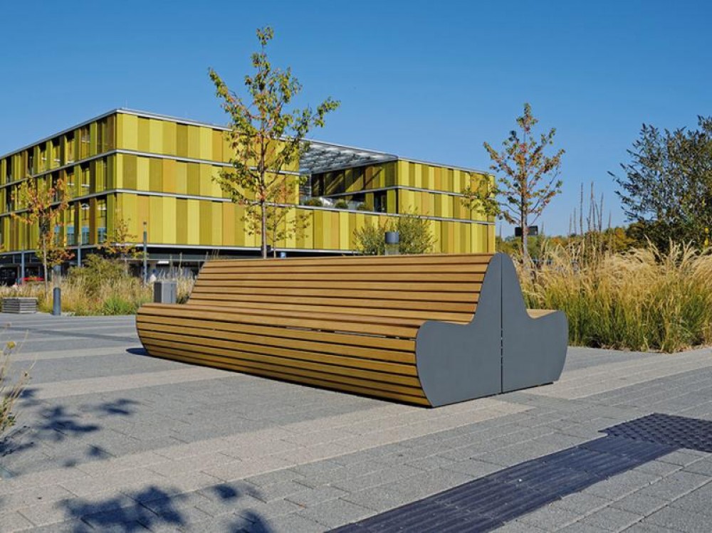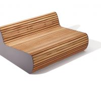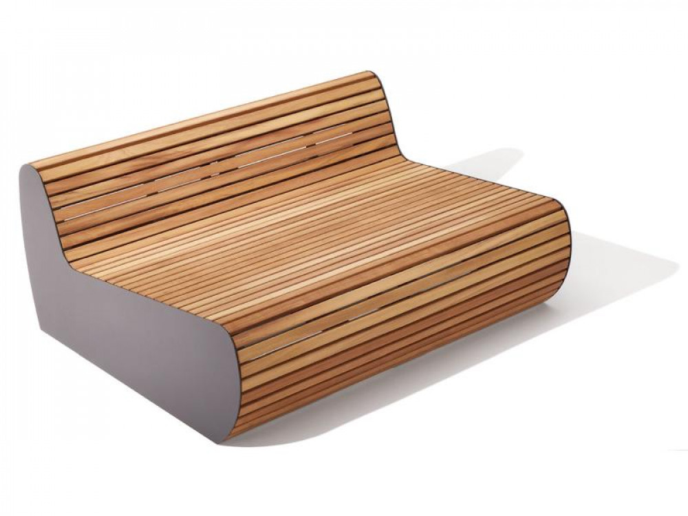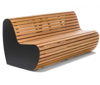 Wellenförmige Bank mit Gestell aus gebogenem Flachstahl. Die hinten nach unten gezogene Holzauflage sorgt für überraschende Detailansichten. Durchgehende Auflage für Sitzfläche und Lehne. Seitlicher Abschluss gerade geschnitten, mit verzinktem und beschichtetem Blech verkleidet.