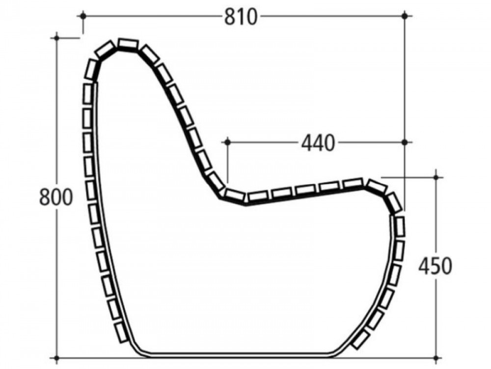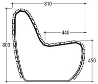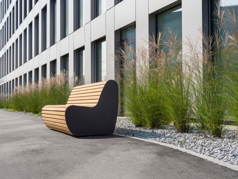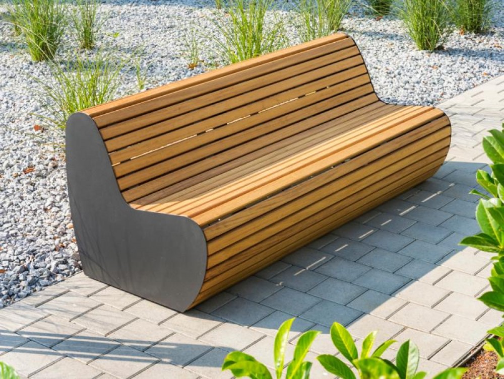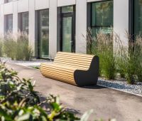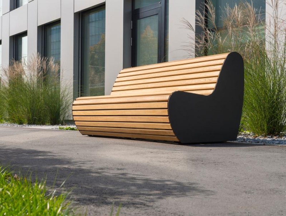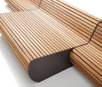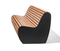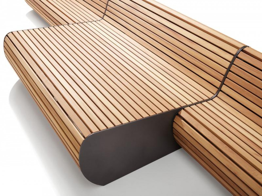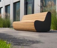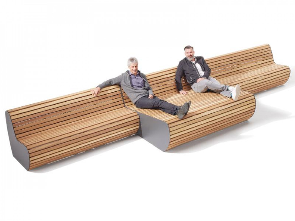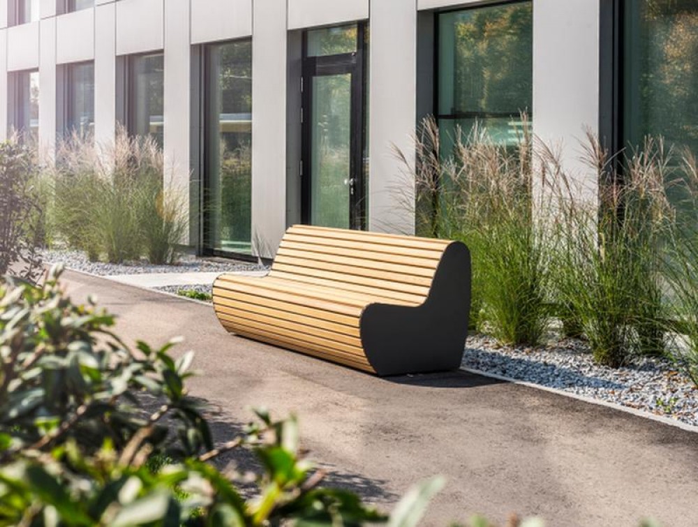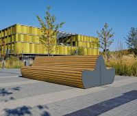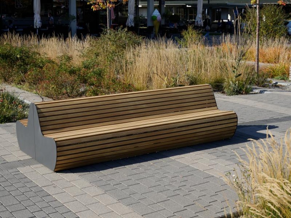 Wellenförmige Bank mit Gestell aus gebogenem Flachstahl. Die hinten nach unten gezogene Holzauflage sorgt für überraschende Detailansichten. Durchgehende Auflage für Sitzfläche und Lehne. Seitlicher Abschluss gerade geschnitten, mit verzinktem und beschichtetem Blech verkleidet.