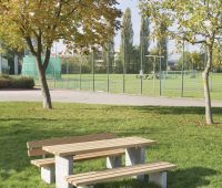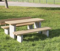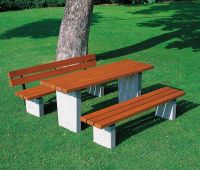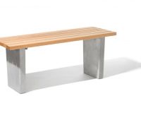 Auflage leicht abnehm- und stapelbar, Betonfüße aus Sichtbeton, zum ortsfesten Einbau, allseitig gefast. Beschläge verzinkt. Ausführung in FSC® zertifiziertem Hartholz (SCS-COC-001802) oder Kunststoff (Acryl, dunkelbraun Struktur, mit Stahlarmierung). Weitere Holzarten auf Anfrage.