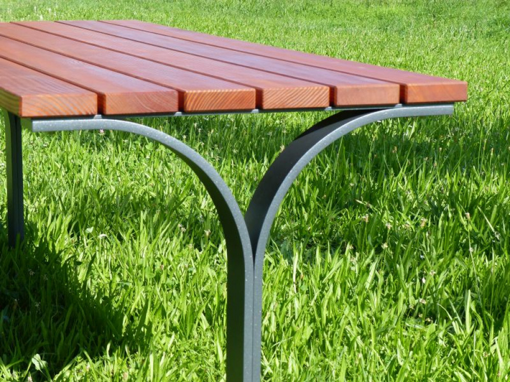 Gestell aus gebogenem Flachstahl 80/1, feuerverzinkt, optional pulverbeschichtet, Standardfarbe anthrazit-eisenglimmer, ähnl. DB 703. Zum Einbetonieren (für Tisch Flexus), alternativ mit Laschen zum Aufdübeln auf GOK (für Tisch Citta)..