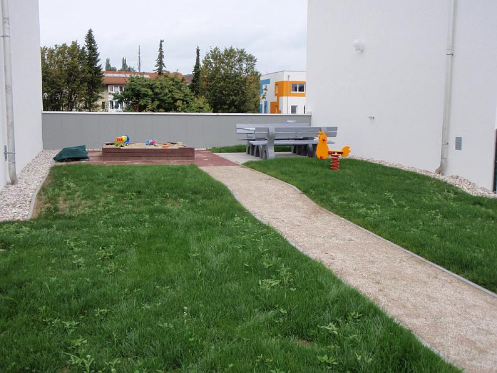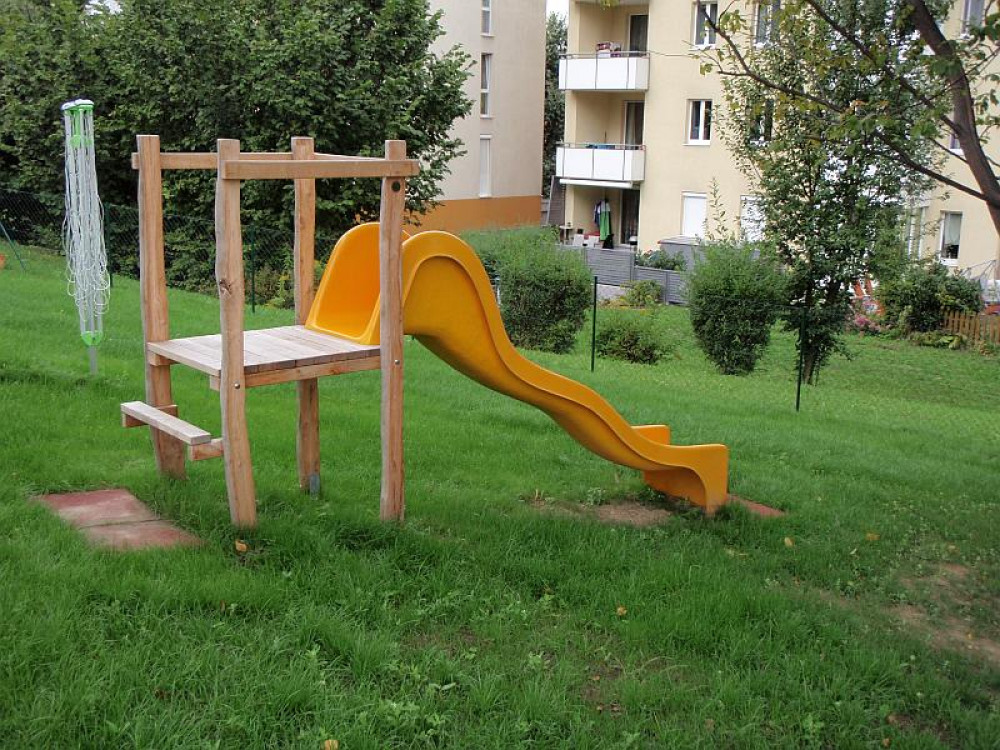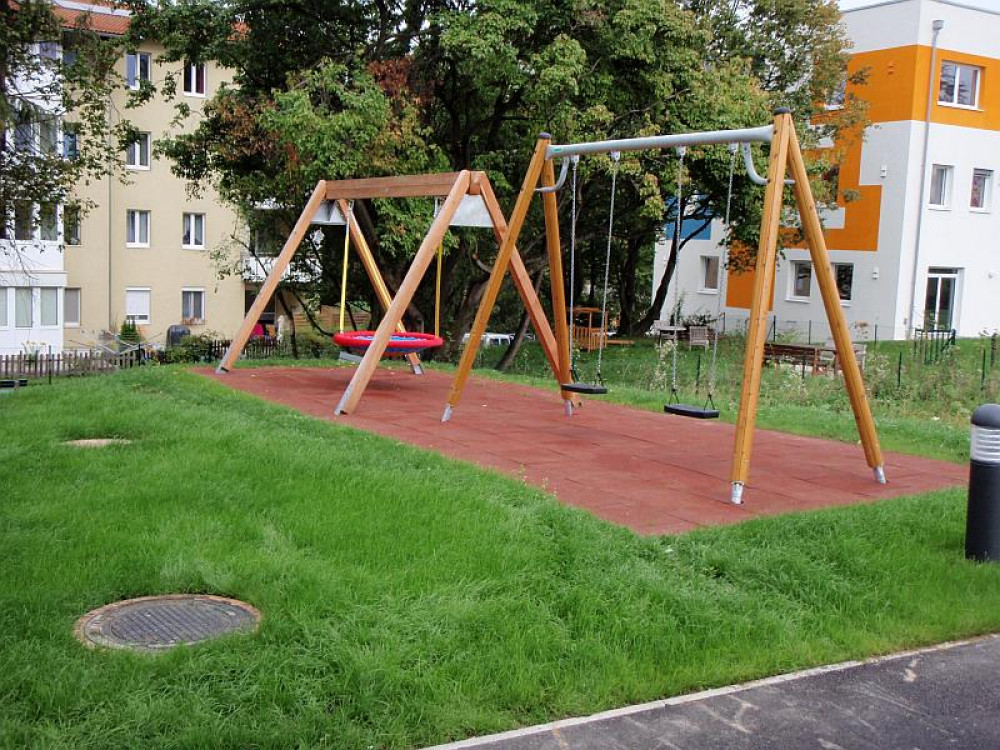 Auf dem Gelände der Wohnhausanlage der BRW zu finden: Eine Doppelschaukel GORO von HAGS, eine Nestschaukel KDI, zwei Sandkästen SYNTAL, eine Federwippe PONY sowie ein Rutschenturm mit Robinienstehern.