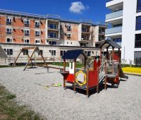 Im westlichen Teil der Wohnanlage befinden sich ein Sandkasten, die Federwippe PONY, eine Balkenwippe, eine Nestschaukel sowie von HAGS die Kleinkinderspielanlage APISTA.