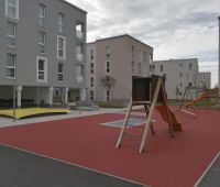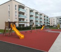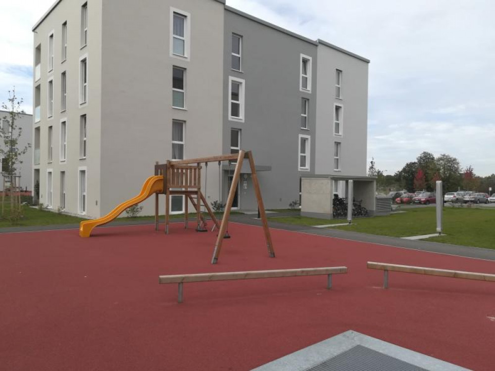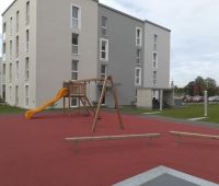 Hier auf dem Gelände der Neuen Heimat durften wir aus dem Stausberg-Programm unsere beliebte Schaukel-Rutschenkombi, einen Rutschenbock, 2 Balancierbalken und 2 Kunststoffsandkasten mit Sonnensegel aufstellen.