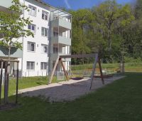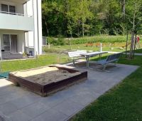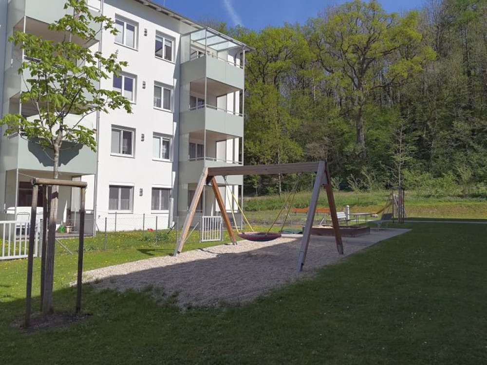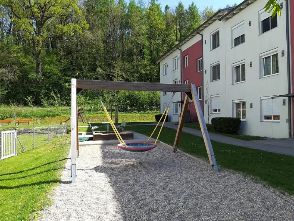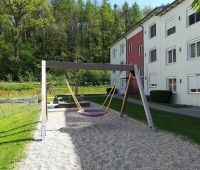 Auch bei einer eher kleineren Wohnhausanlage, wie hier von der EBS, dürfen ein paar Spielgeräte nicht fehlen. Unsere bewährte Nestschaukel sowie der Sandkasten Syntal aus recyceltem Kunststoff wurden hier im August 2015 mit der Baufirma Gebrüder Lang aufgestellt.