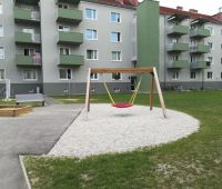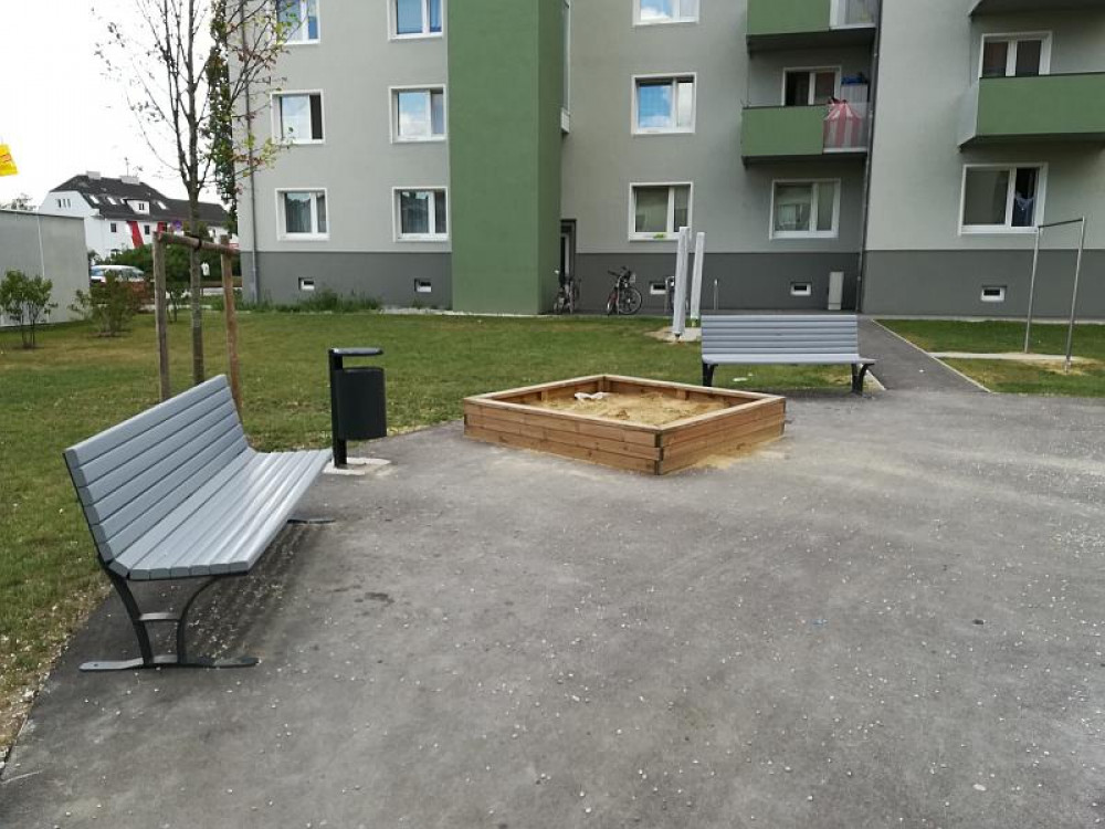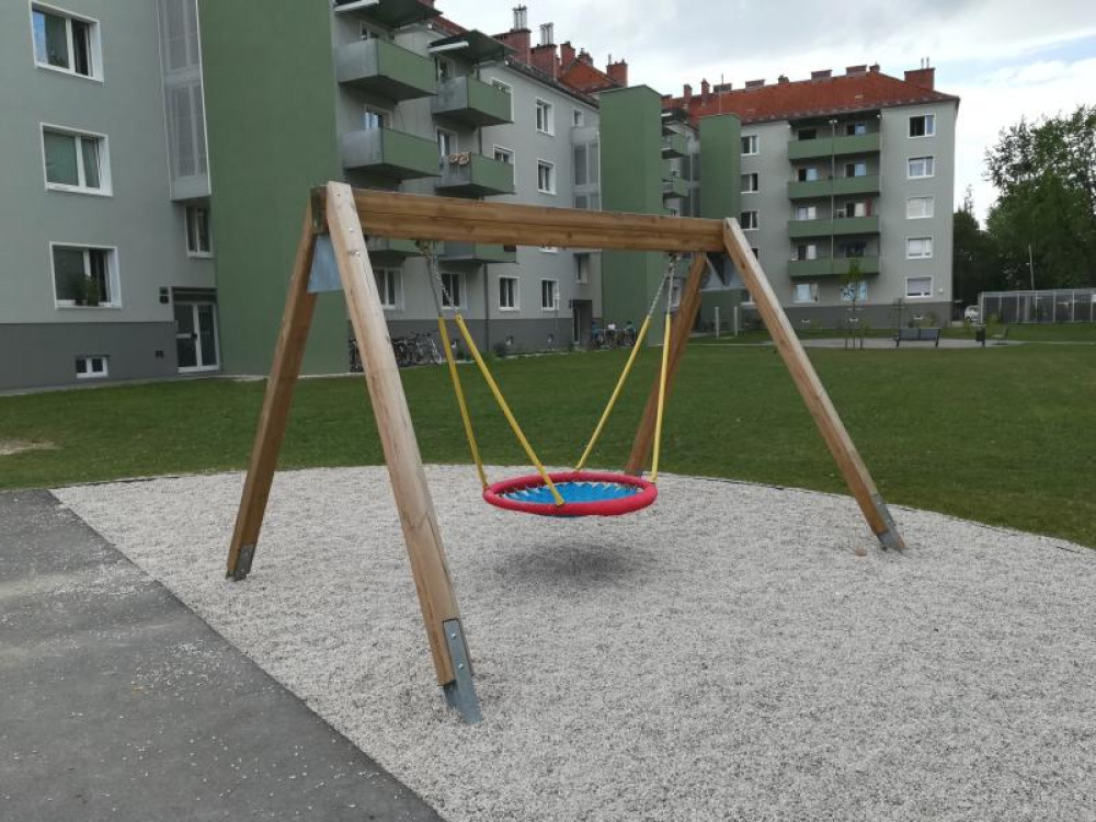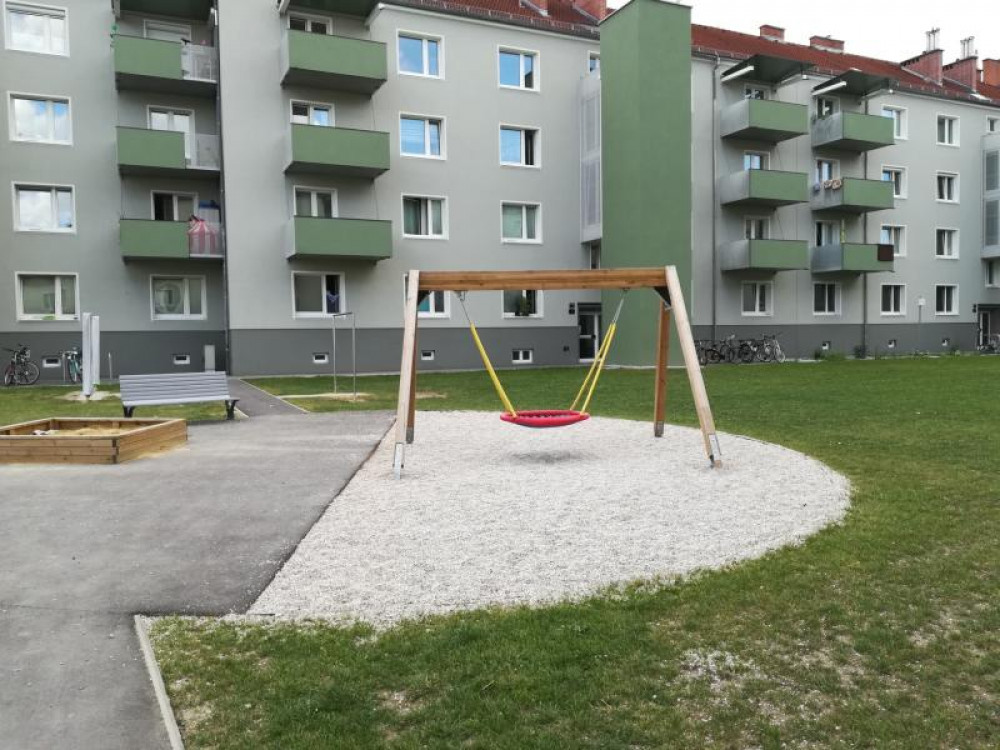 Im Zuge der Neugestaltung der Außenanlage in der Laahenerstraße 6-12 in Wels, Oberösterreich, wurde der Platz mit einer neuen Nestschaukel und einem Sandkasten bestückt.