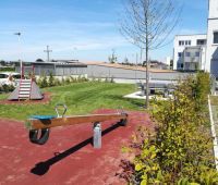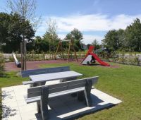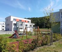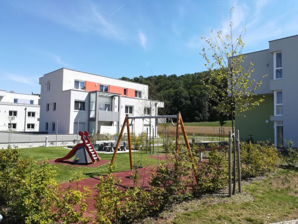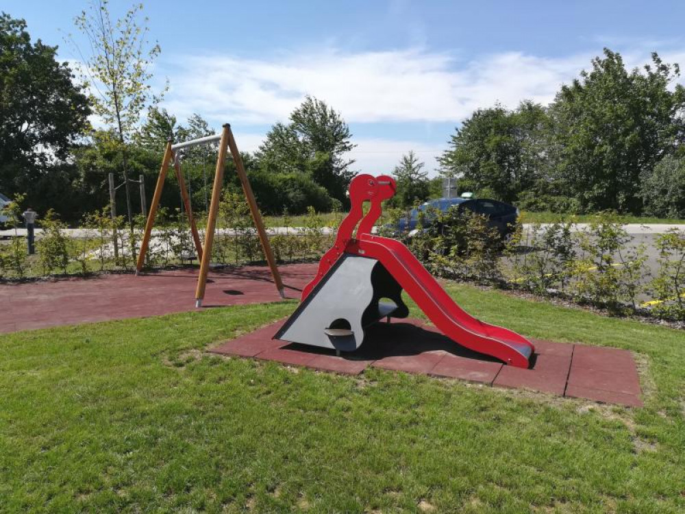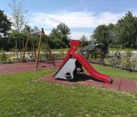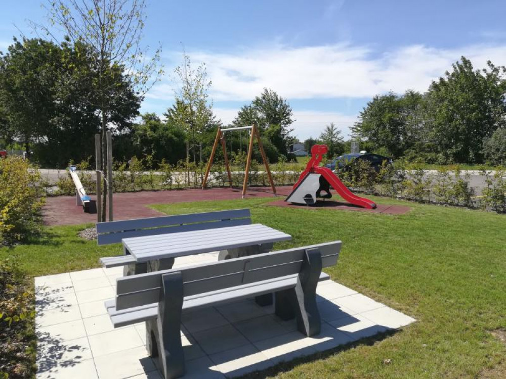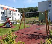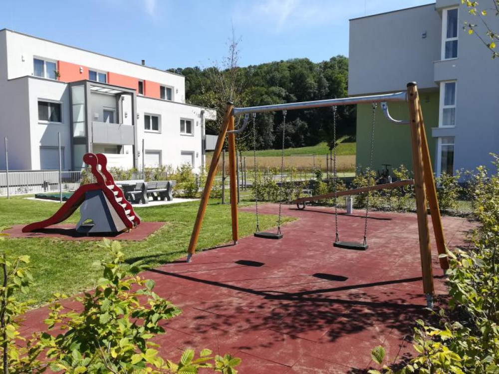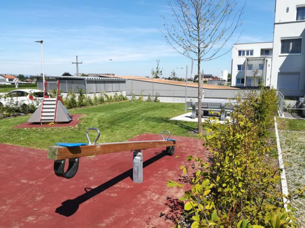 Ein kleiner neuer Spielplatz auf dem Gelände der von der Wohnungsgenossenschaft "Lebensräume" errichteten Wohnhausanlage in Pucking. Aus dem HAGS-Programm befindet sich dort seit August 2016 die 2-fach Schaukel GORO und die Kleinkinderrutsche LARVEN HOUSE. Ergänzt wird der Platz durch eine Stausberg Balkenwippe, einen Sandkasten aus recyceltem Kunststoff und unserer Sitzgruppe RENNSTEIG mit Acryl-Belattung und Füßen aus Kunststoff.