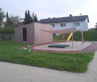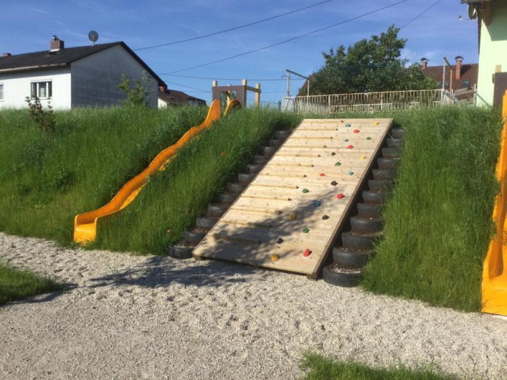 Auf dem Gelände befinden sich aus unserem HAGS-Programm 2 Doppelschaukeln GORO, 1 Kleinkindernestschaukel LILLIE+DOLLY, 3 Federwippen KLIMP und die kleine Wasserspielanlage CRANO. Weitere Spielgeräte aus unserem Stausberg-Programm sind 3 Hangrutschen, teilweise mit schrägen Kletteraufstiegen, ein separater Sandkasten, ein kleines Robinienspielhaus und eine frei angelegte Sandspielfläche mit Sonnensegel.