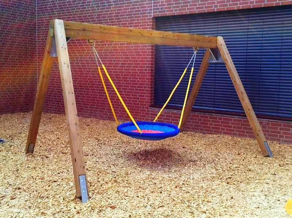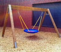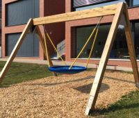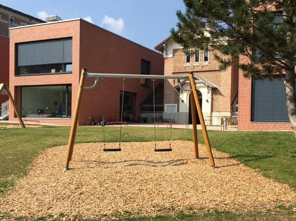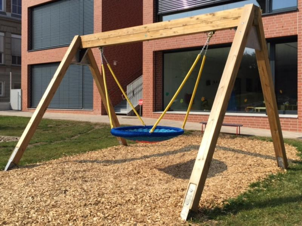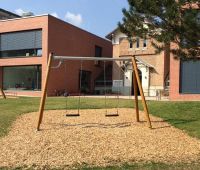 Aus dem Stausberg-Programm stehen den Kindern 2 Nestschaukeln, eine Hangrutsche, eine Wasserspielpumpe und eine Kleinkinderbreitrutsche mit Treppenaufstieg sowie 2 Sandkästen. Ergänzt wird der Spielplatz noch durch eine HAGS 2-fach Schaukel Goro.